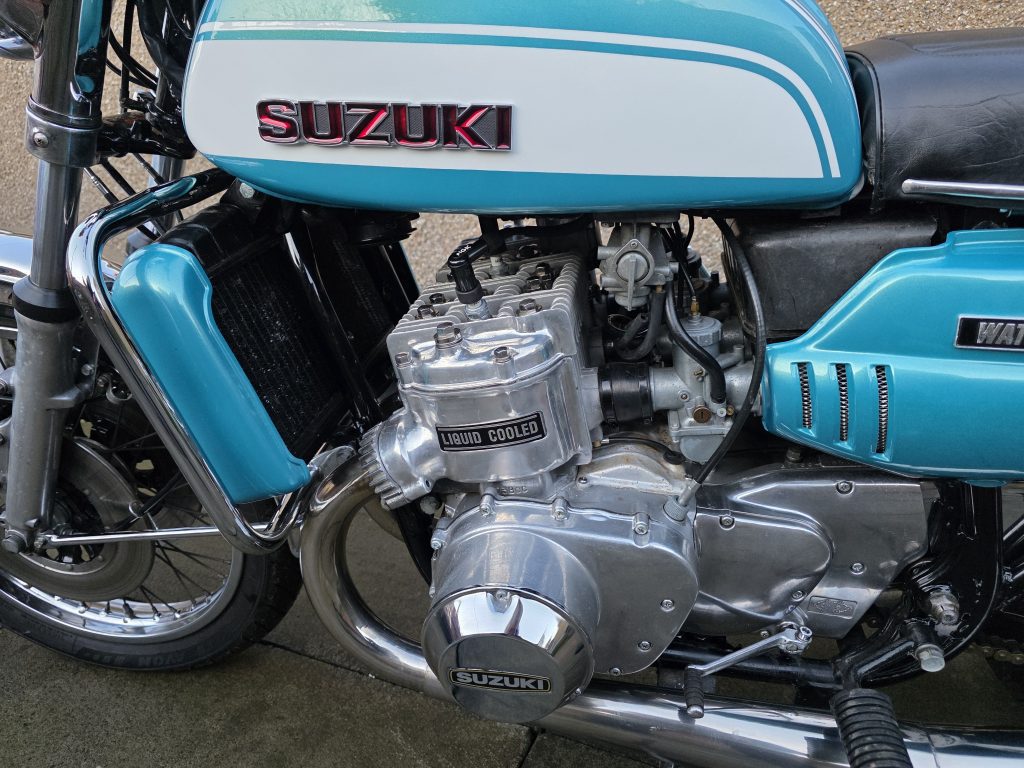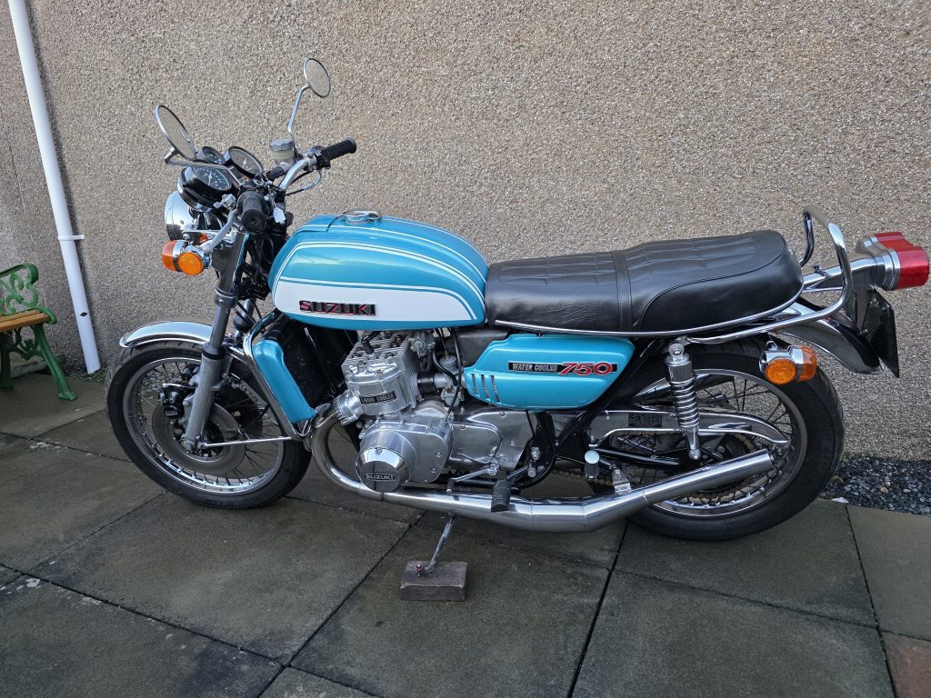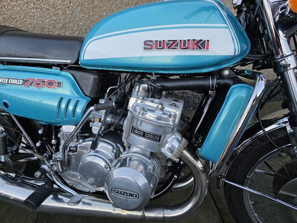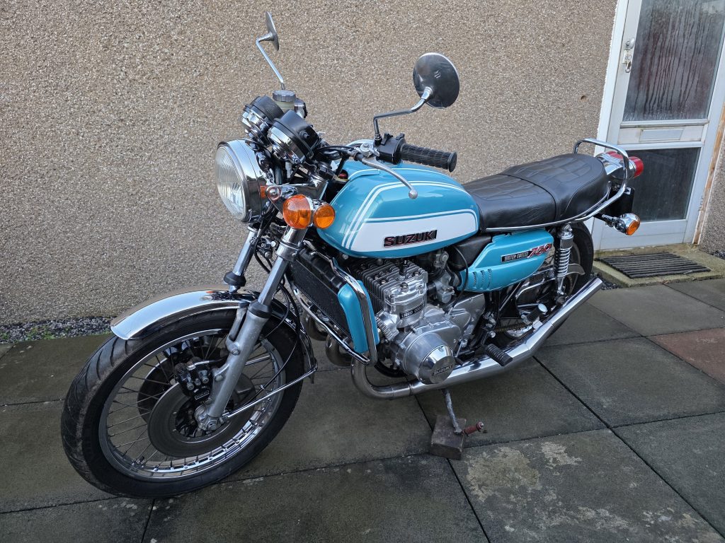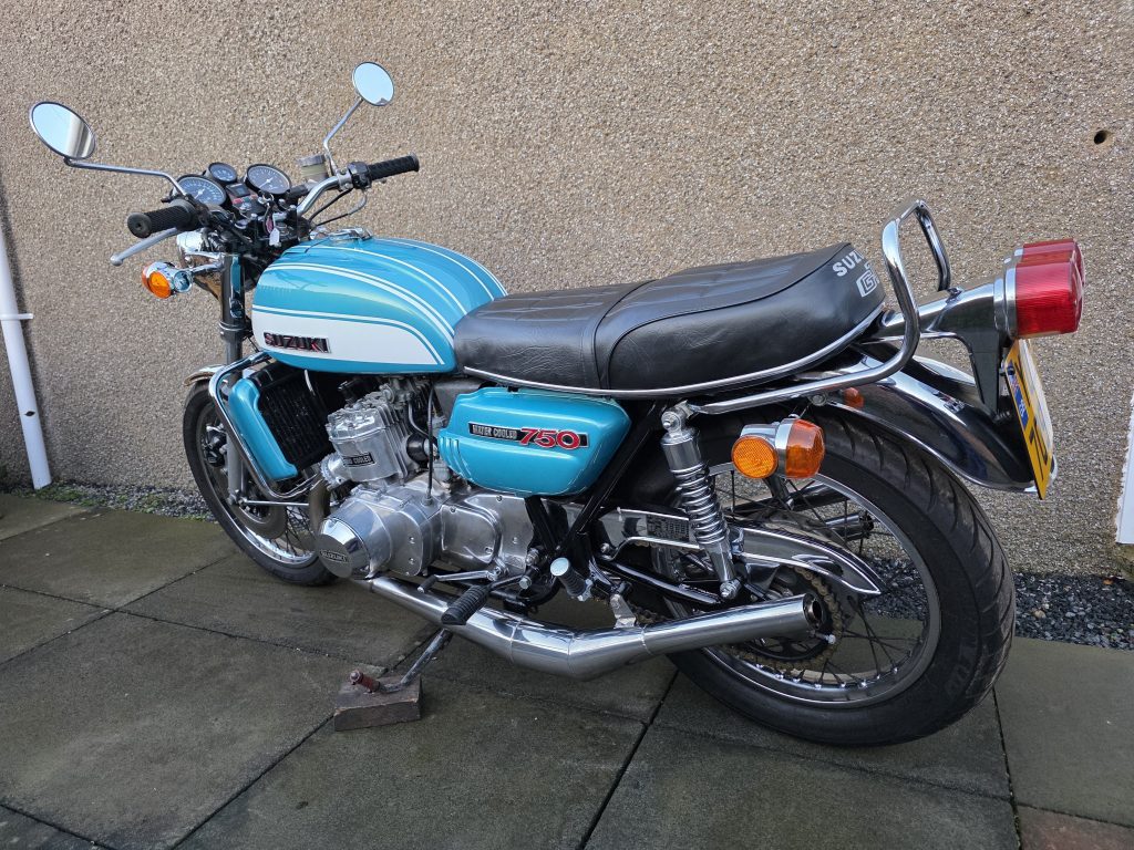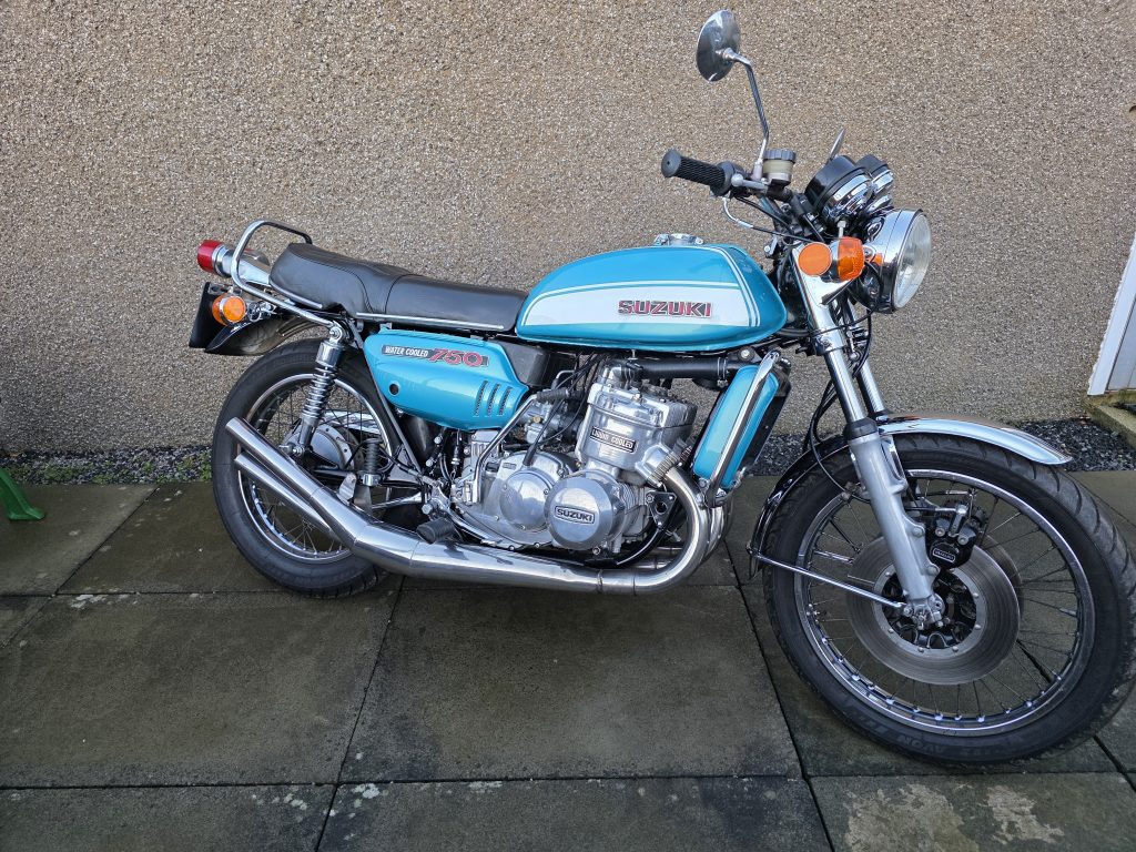 1972 Suzuki GT750. A very tidy bike that starts on the button, sounds lovely and goes as good as it looks. Piles of receipts showing thousands spent over the years. Fitted with Higgspeed expansion pipes, standard pipes included in sale.